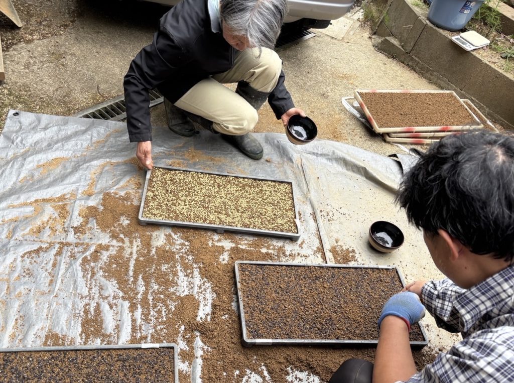 浸水した種籾を温湯消毒したものと、何もしないで直播きするものと2種類の種を育苗箱に播種。育苗土も無肥料の一般建設土を使用。
