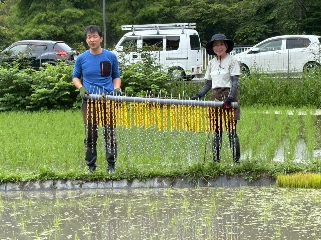 今年はチェーン除草機を自作して、これを田んぼ内で引いてみる。毎週1 回1ヶ月後まで計4回やる。これだけでは取りきれないので、この間2日おきくらいに田んぼに入って小型のレーキで手除草を繰り返す。